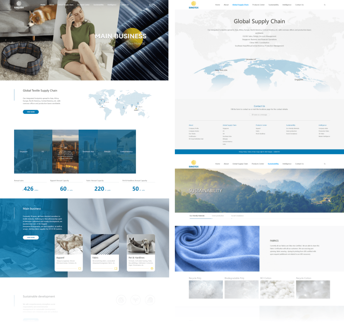 Singtex, starting with fabric export business, gradually grows into aninternational green textile manufacturing enterprise with an integration of R&D,Design, Production and Marketing for fabrics, apparel, pet products, home andhardlines.